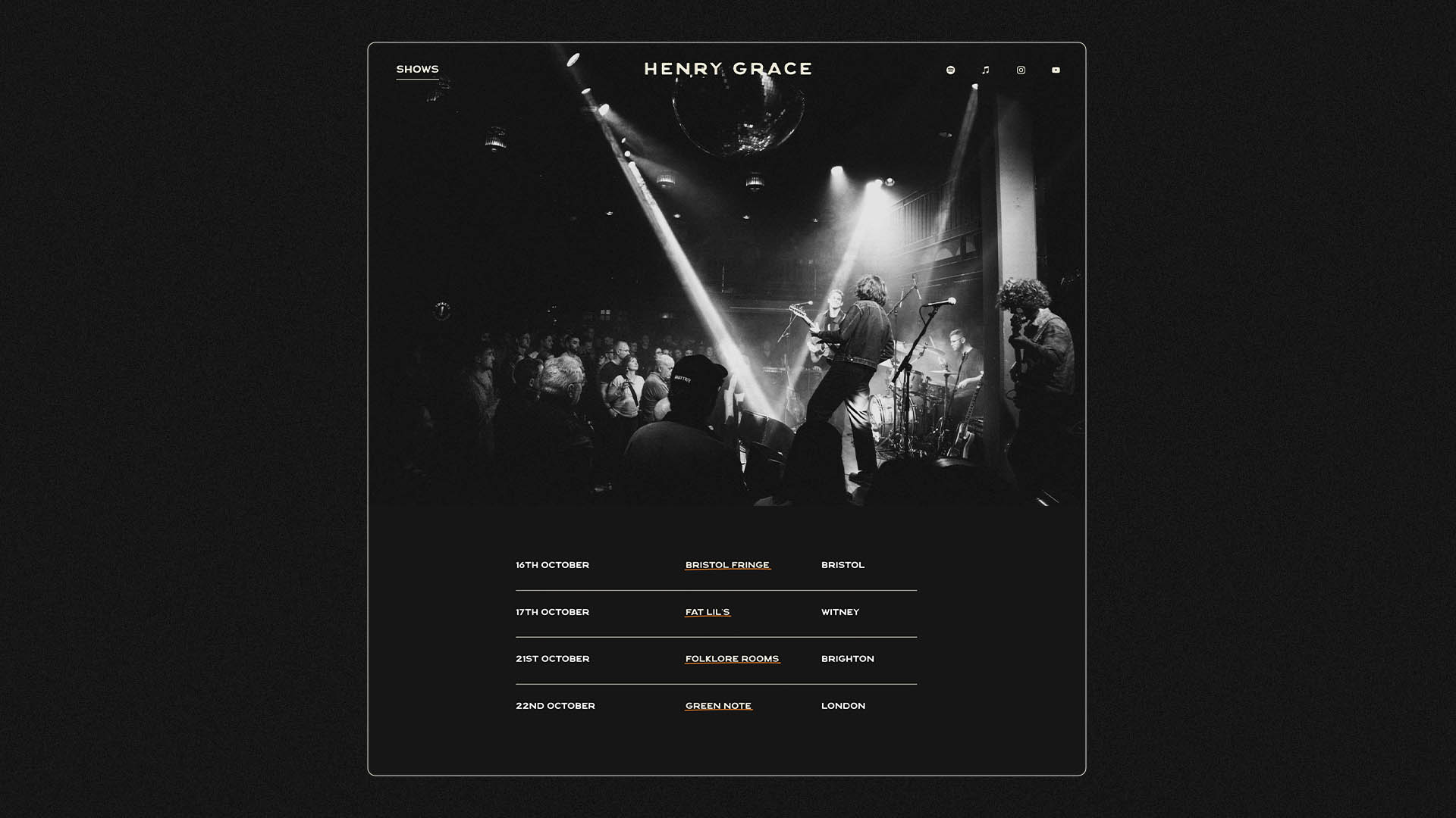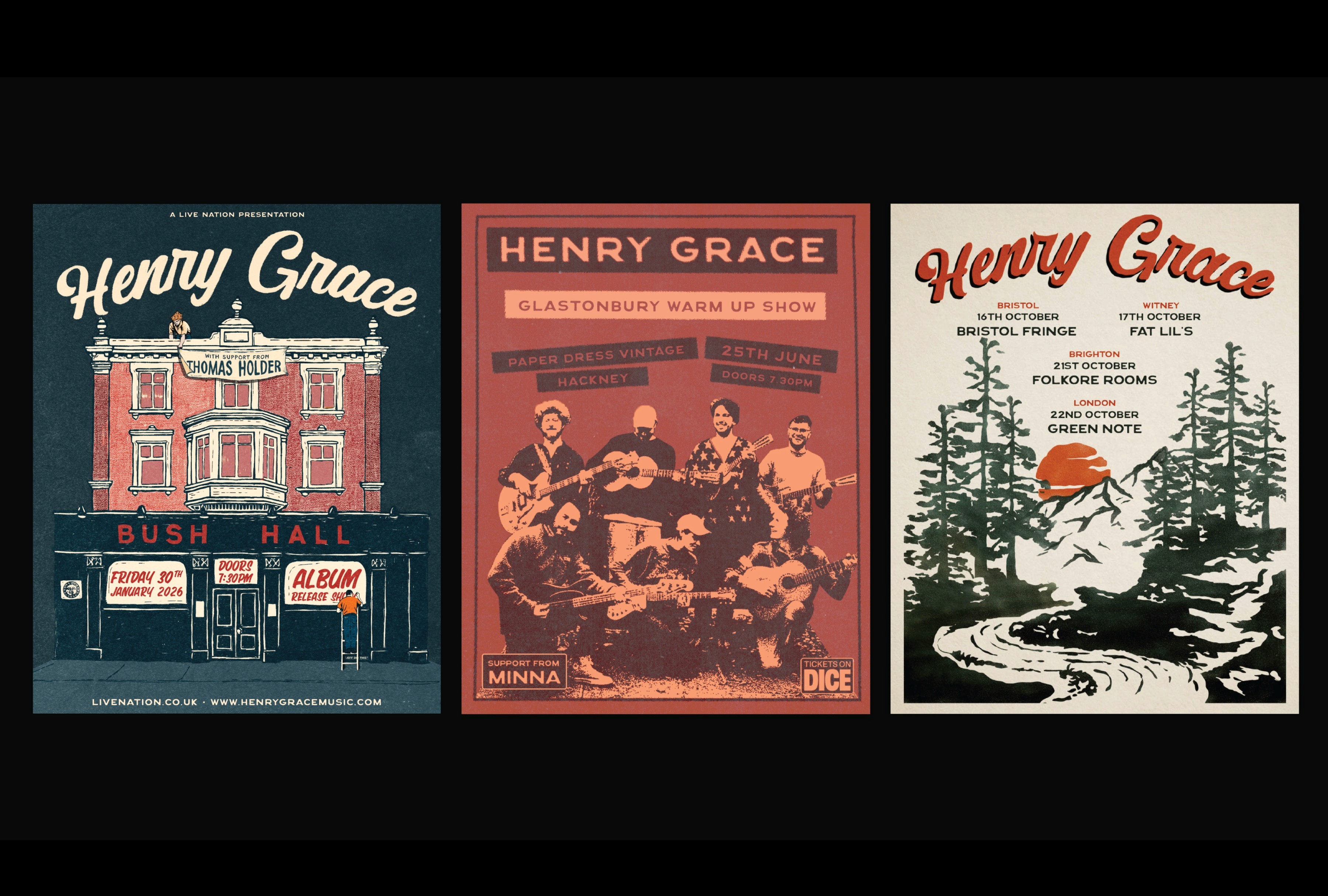 I work alongside musician Henry Grace to create visual assets that support and extend his sound—designing everything from posters, merch, social media assets, videos to web design. His music draws on a raw, emotionally grounded style rooted in the Americana genre, and the visual identity reflects that: rustic, vintage-inspired and intentionally unpolished. The branding leans into texture, visuals that feel lived-in and honest. Most recently, I’ve been developing the artwork for his upcoming album, building on this aesthetic to create a cohesive and intimate world around the music.