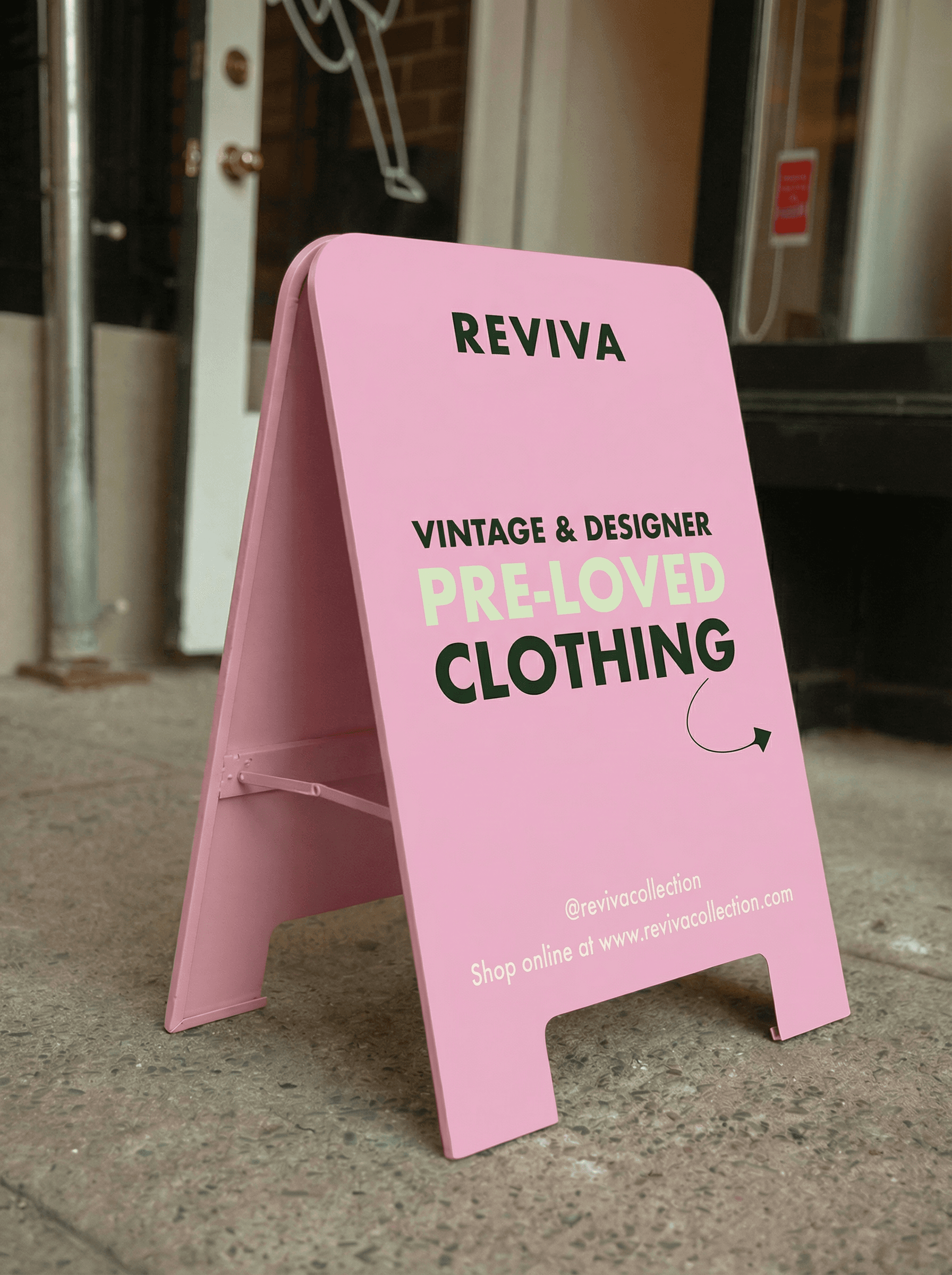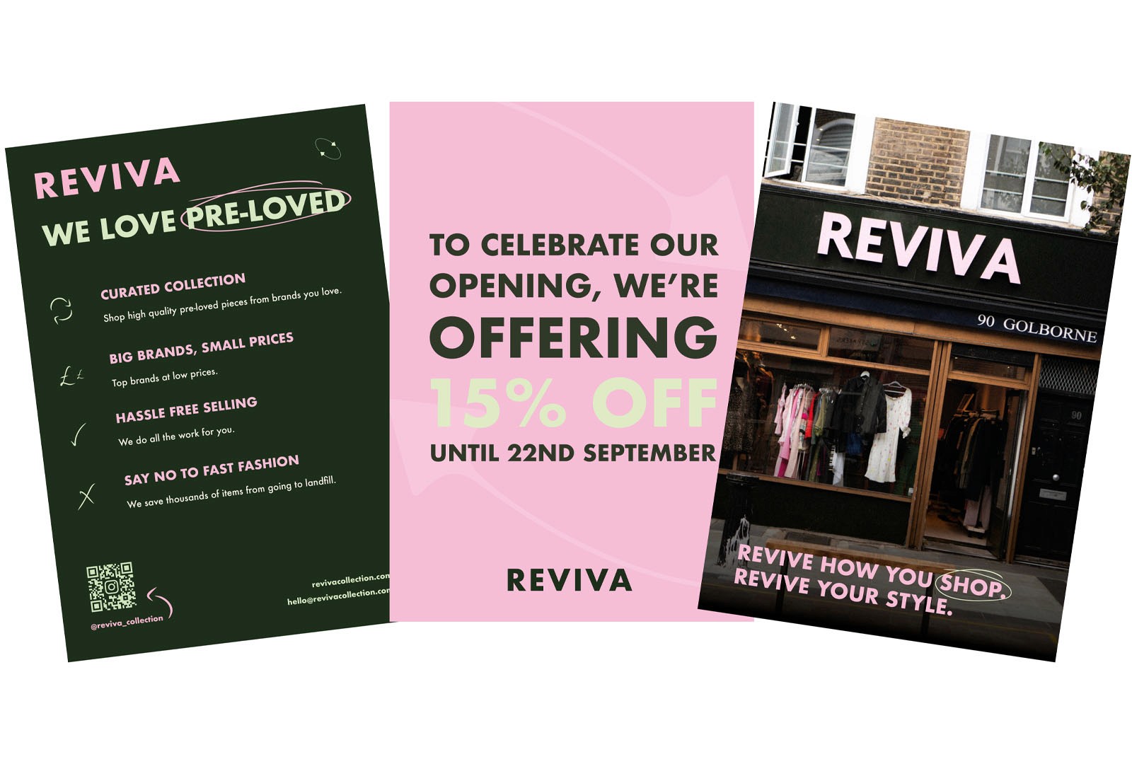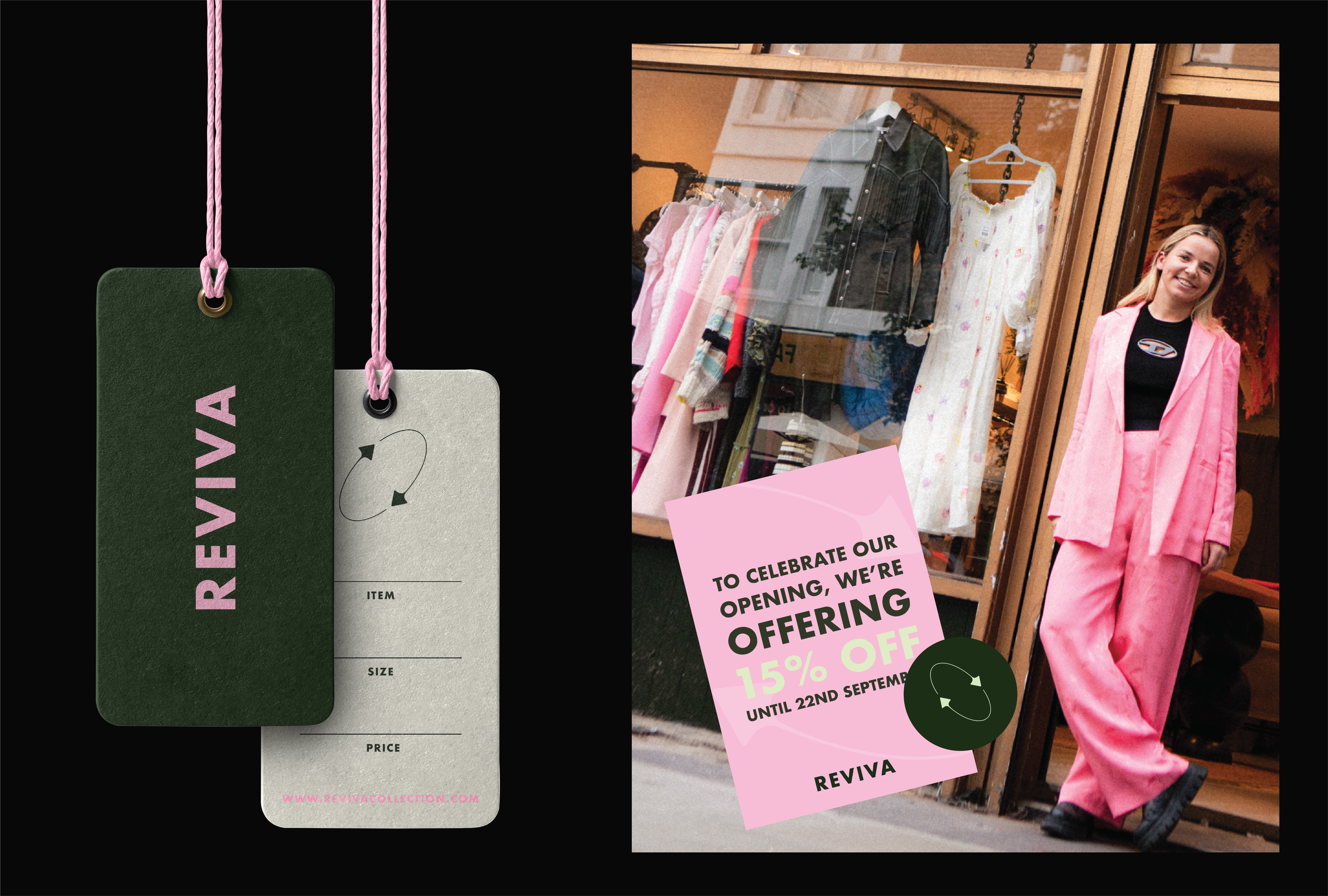 The brand needed to feel youthful, bold, and uncompromising, reflecting a new kind of fashion activism that’s as stylish as it is sustainable. Alongside the visual identity, I designed in-store print assets including signage, all crafted to energise the REVIVA community and bring its mission to life in a fresh, punchy way.
